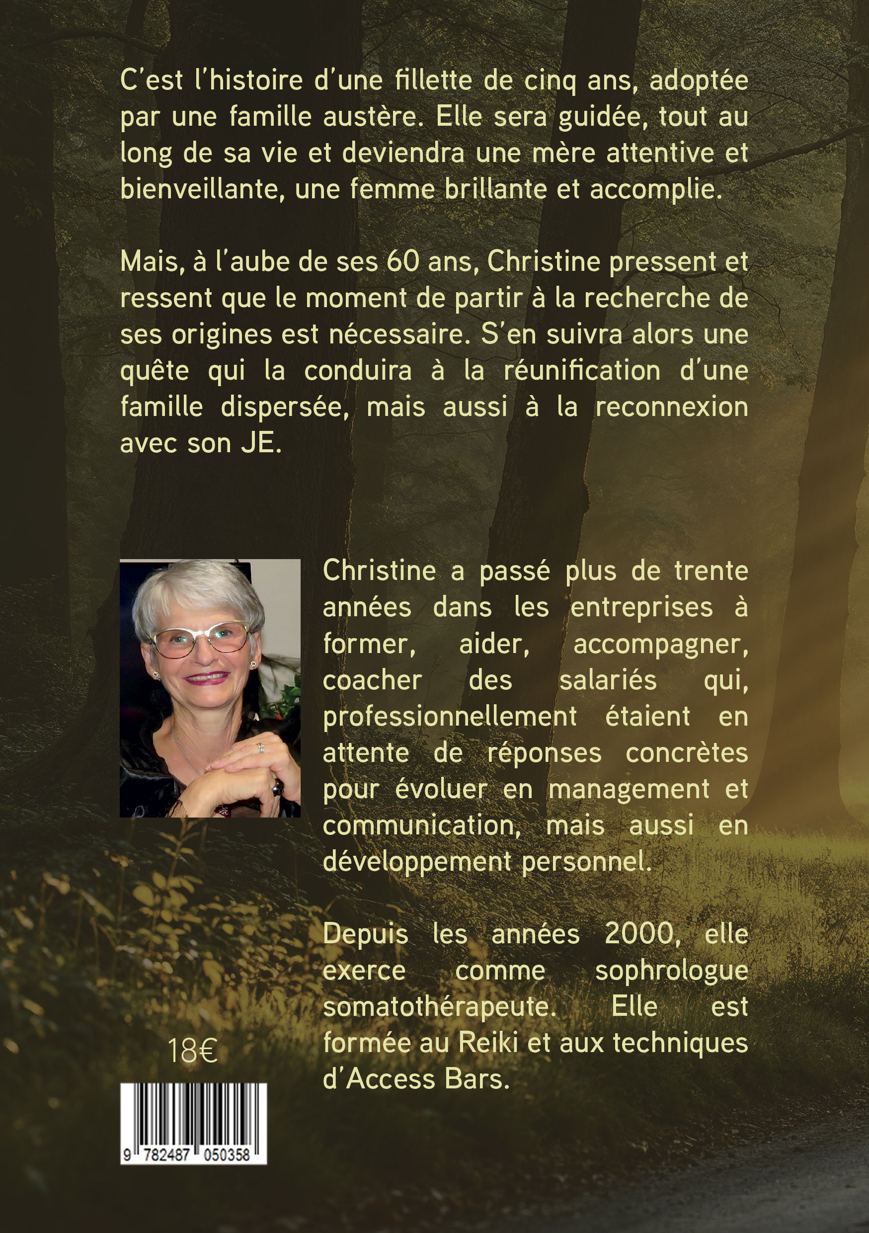 Ce livre est l’histoire d’une fillette de cinq ans, adoptée par une famille austère. Elle sera guidée tout au long de sa vie et deviendra une mère attentive, bienveillante et une femme brillante et accomplie. Mais à l’aube de ses 60 ans, Christine pressent que le moment de partir à la recherche de ses origines est enfin arrivé. S’en suivra alors, une quête qui la conduira à la réunification d’une famille dispersée, mais aussi à la reconnexion avec son JE.
